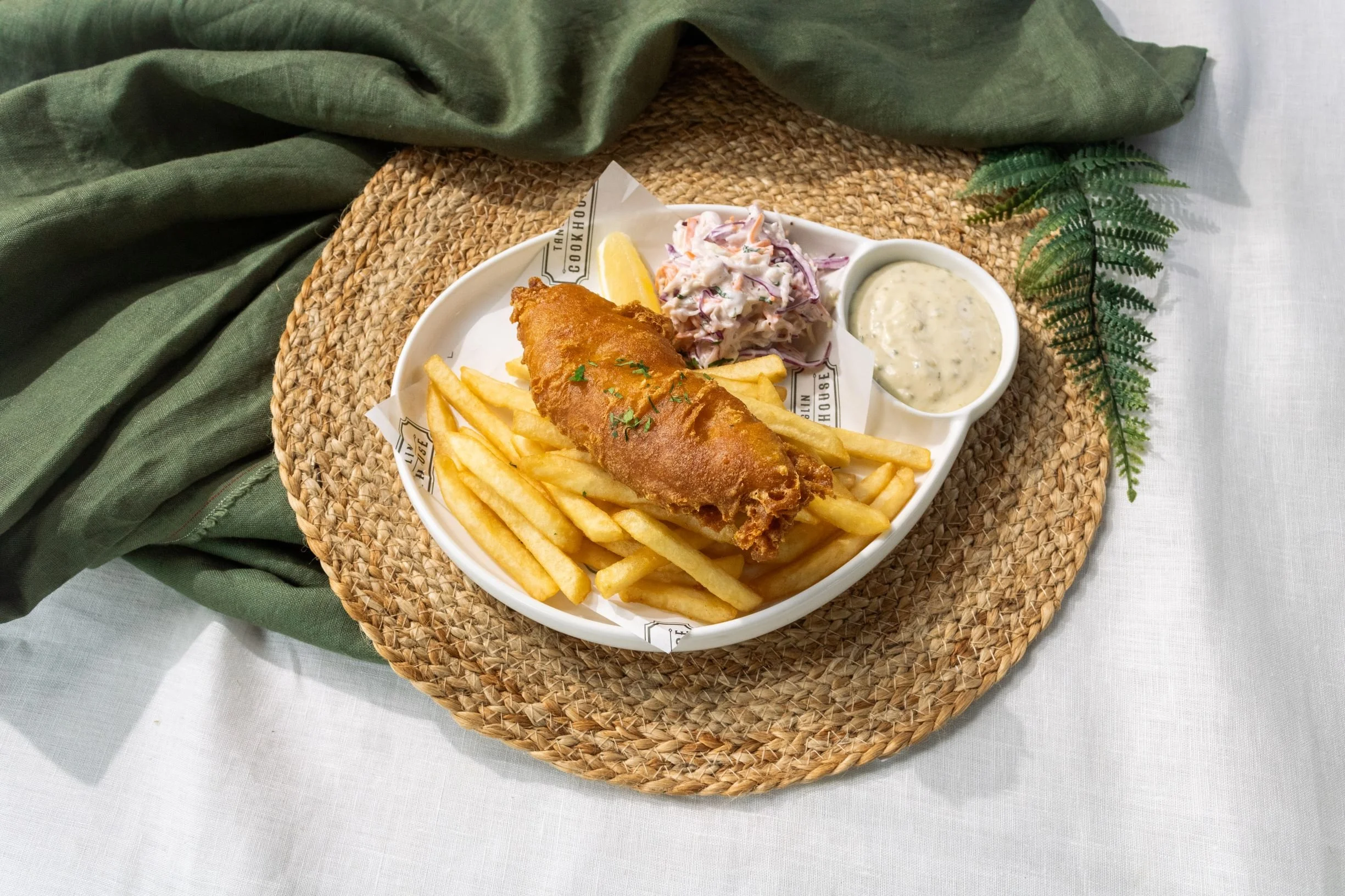 Mini Fish and Chips ($16): Golden, crispy fish served alongside fresh coleslaw and a zesty garlicky tartar sauce.