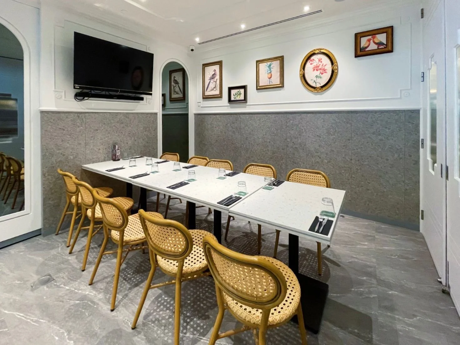 The private room at Tanglin Cookhouse's Tanglin Mall outlet is a secluded haven designed for a truly unforgettable event. With its lush British Colonial aesthetic, this exclusive enclave promises a journey back in time, all while providing modern amenities to ensure your gathering is a resounding success.